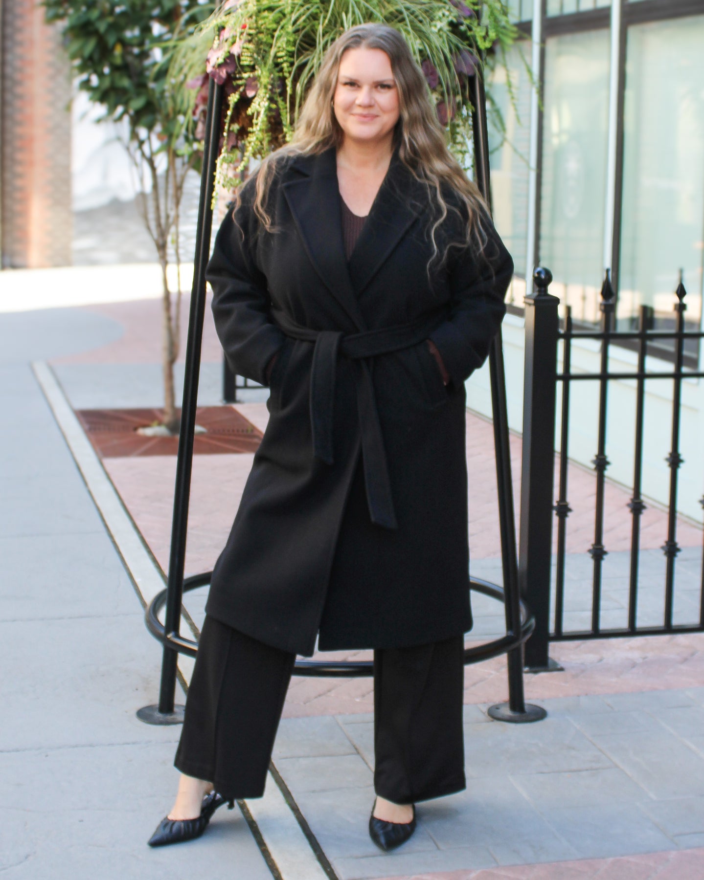 Elevate any outfit this fall and winter with the Jannet belted long coat. This coat is perfect for throwing on in a pinch or to wear to your next big event making it a wardrobe essential. This coat features two functional pockets, a matching belt, and two interior buttons.