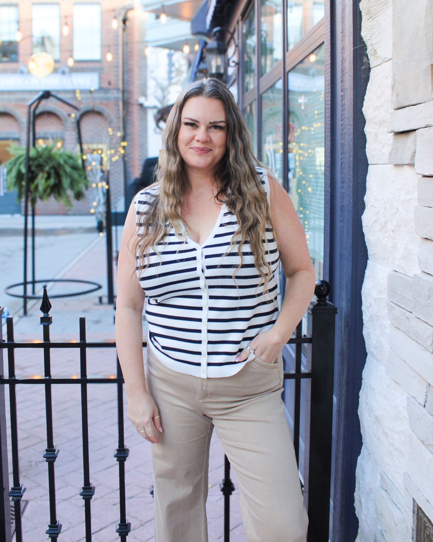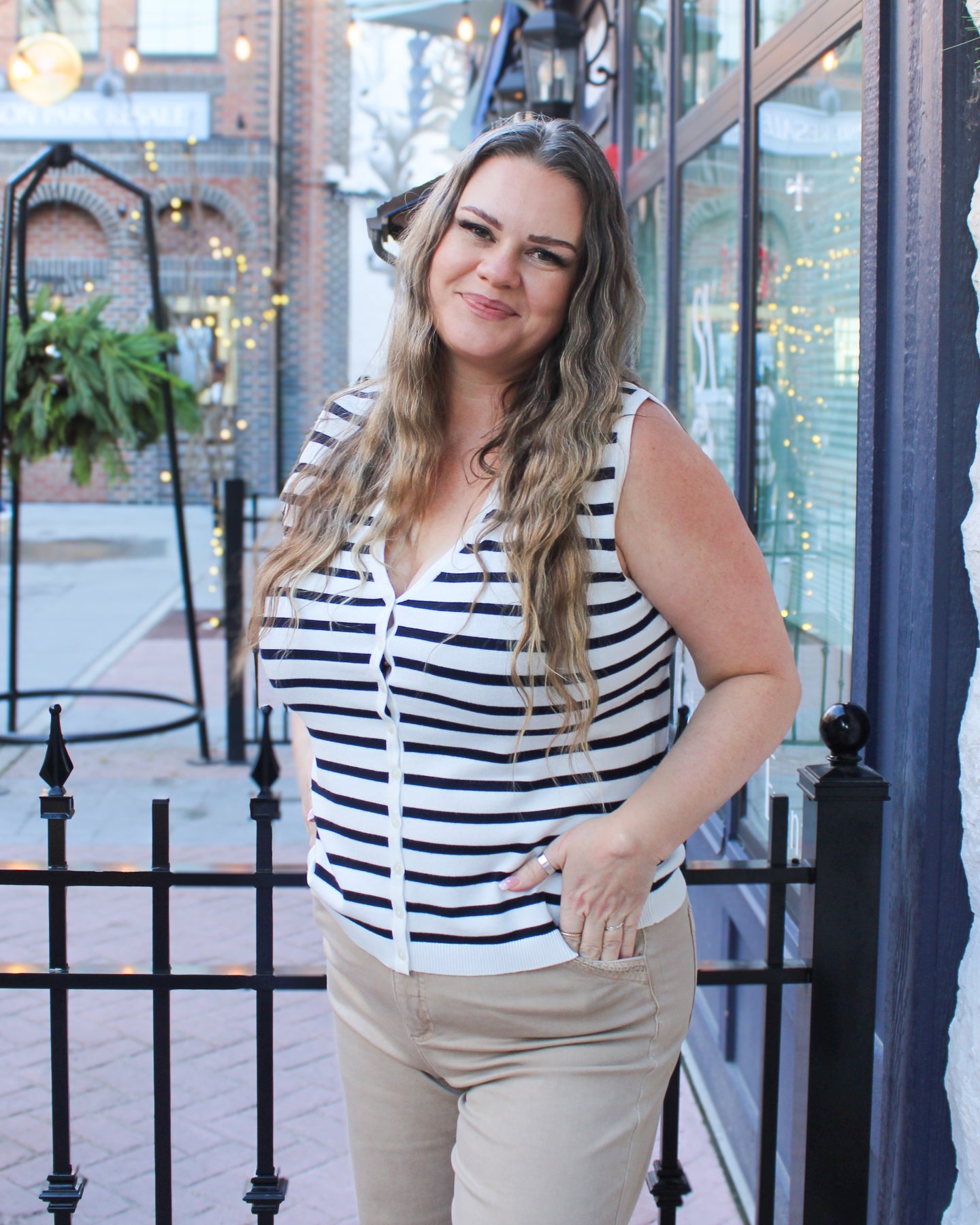 Classic and chic the LUSA button up vest is a soft, fine-knit sweater vest. V-neck and matching pearly white buttons at the front pull it together for a chic look with a white pant.