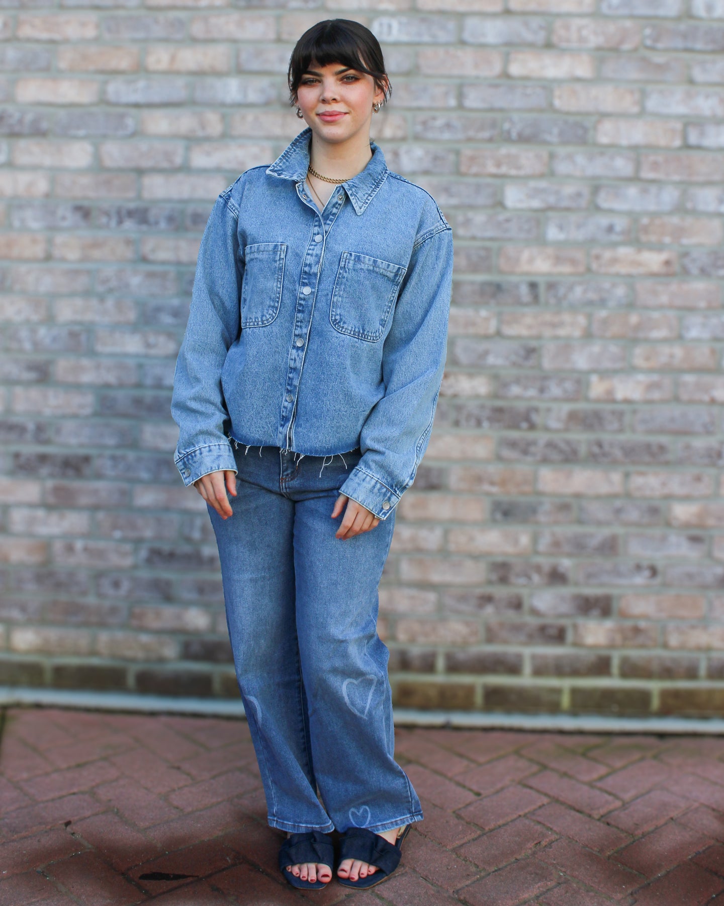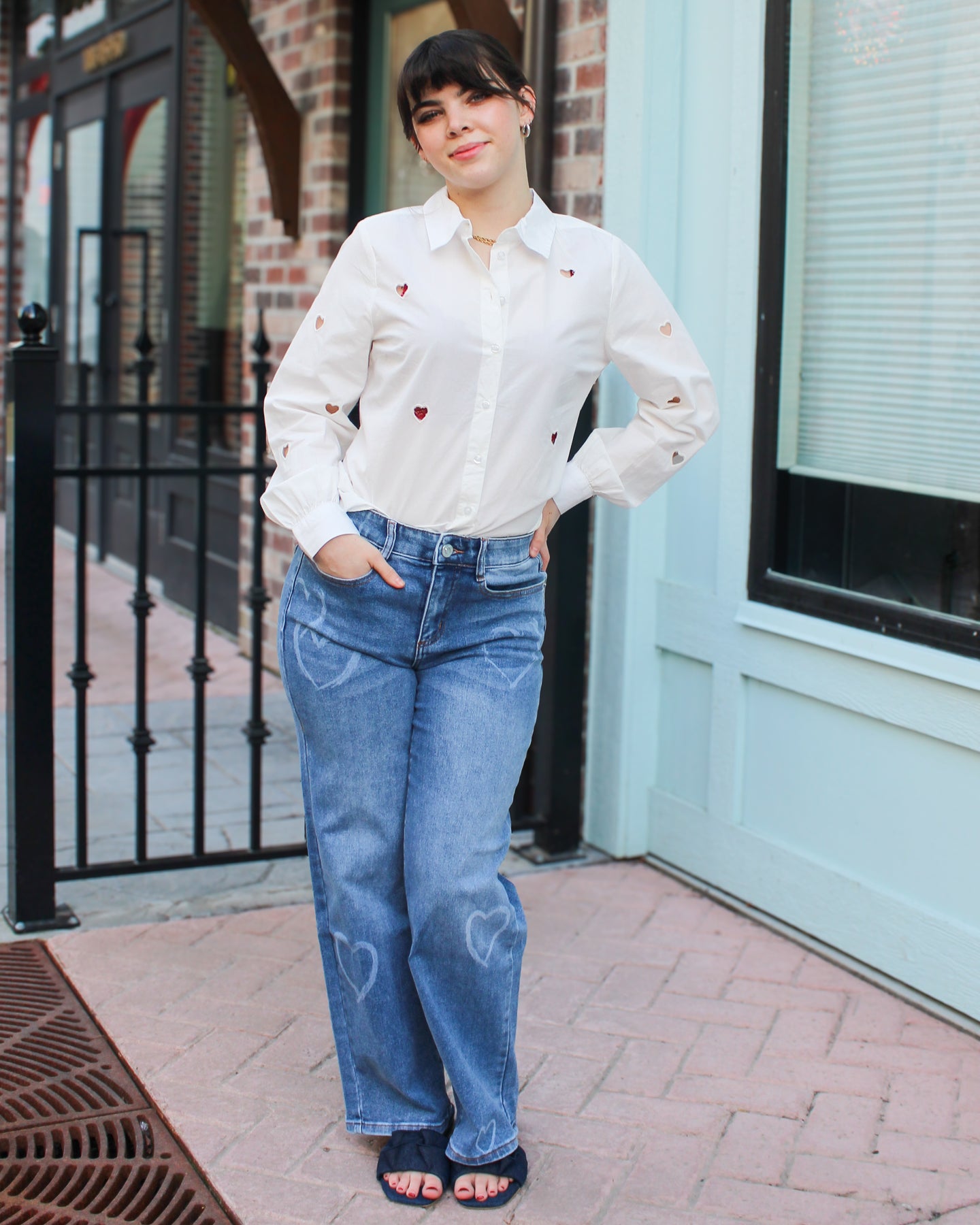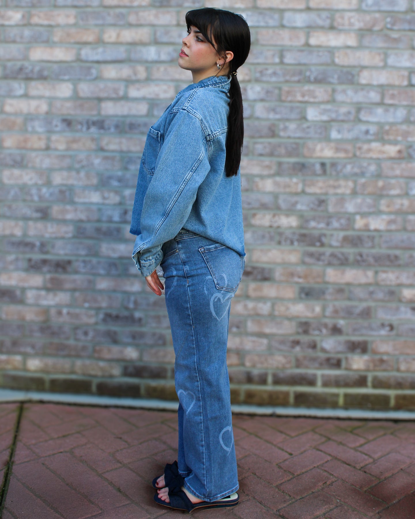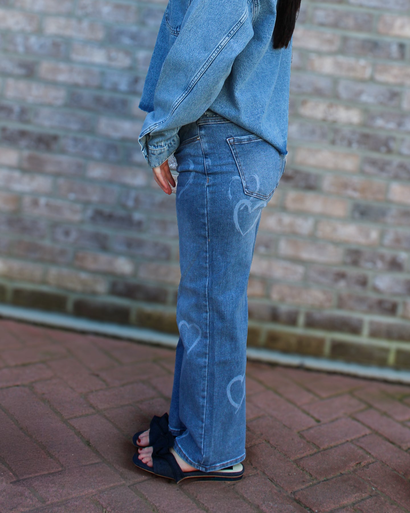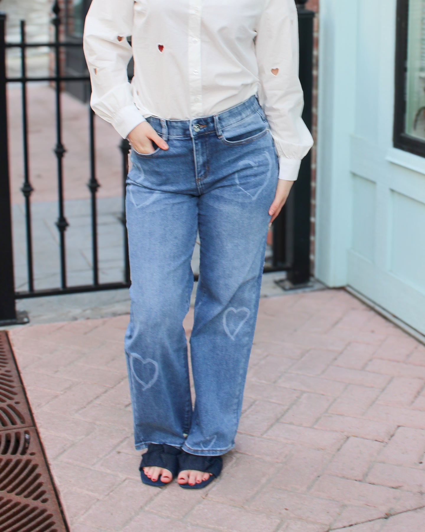 Crafted from timeless denim with a hint of stretch, these mid-rise jeans offer exceptional comfort and a flattering silhouette. The straight-leg cut is gracefully balanced by a fitted waist. Thoughtfully designed with bleached hearts for added detail and pockets enhance both functionality and style, making them as practical as they are stylish.