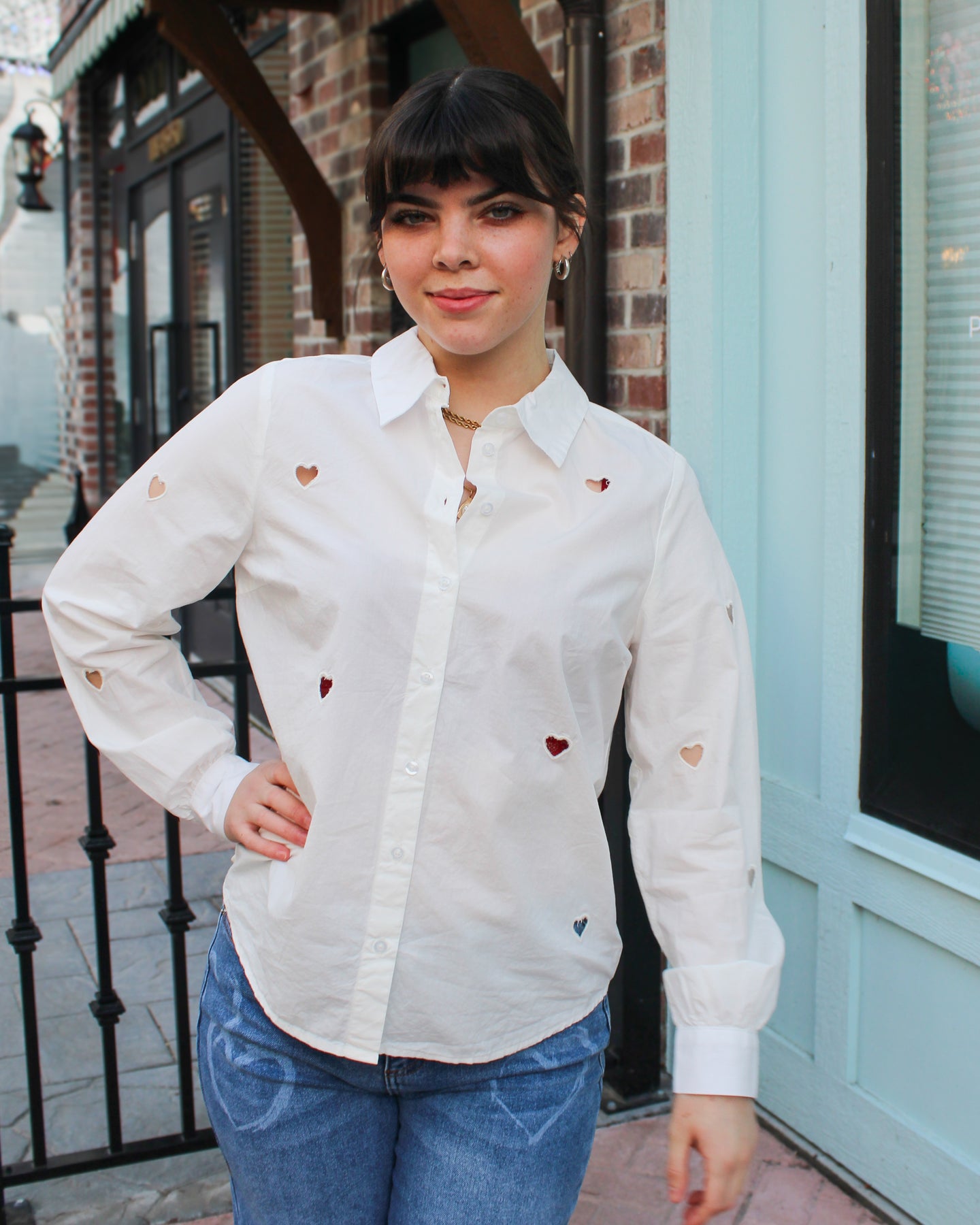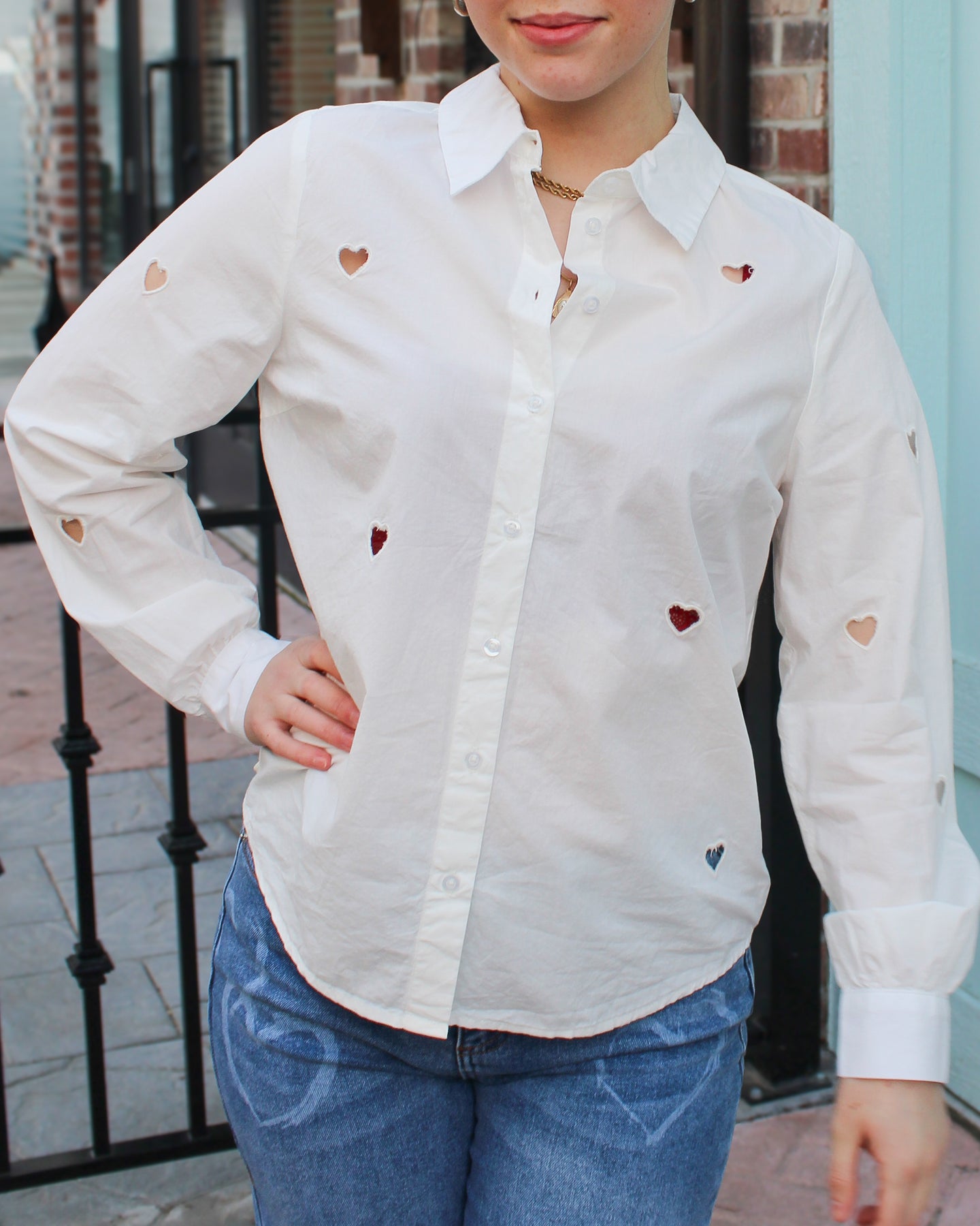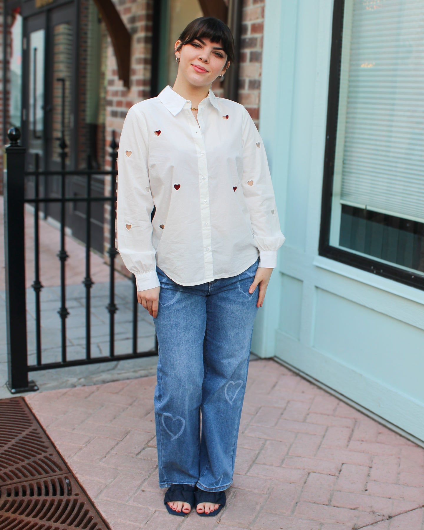 This slightly oversized shirt features a crisp pointed collar, full length button placket, and long sleeves with buttoned cuffs. Clean lines and a straight silhouette create a contemporary, minimalist look with a smooth, soft finish. This top is finished off with embroidered heart cut outs for a unique flare.