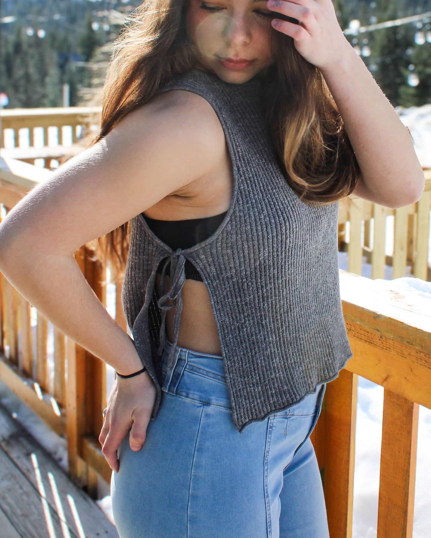 Level up every look with this cool and contemporary sweater top featured in a sleeveless style and ribbed knit fabrication with dropped armholes and tie closures at sides for added dimension.